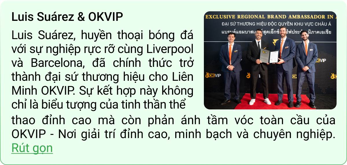 Liên Minh OKVIP là một trang liên minh các thương hiệu giải trí trực tuyến hàng đầu Châu Á, đóng vai trò cầu nối giữa khách hàng và các thương hiệu đình đám trong đó có OK9. OKVIP là đối tác với thương hiệu thể thao danh tiếng như Argentina AFA, CLB Villarreal FC và đặc biệt siêu sao bóng đá Luis Suárez – Đại sứ thương hiệu độc quyền, đánh dấu bước ngoặt phát triển toàn cầu mạnh mẽ trong ngành giải trí trực tuyến.