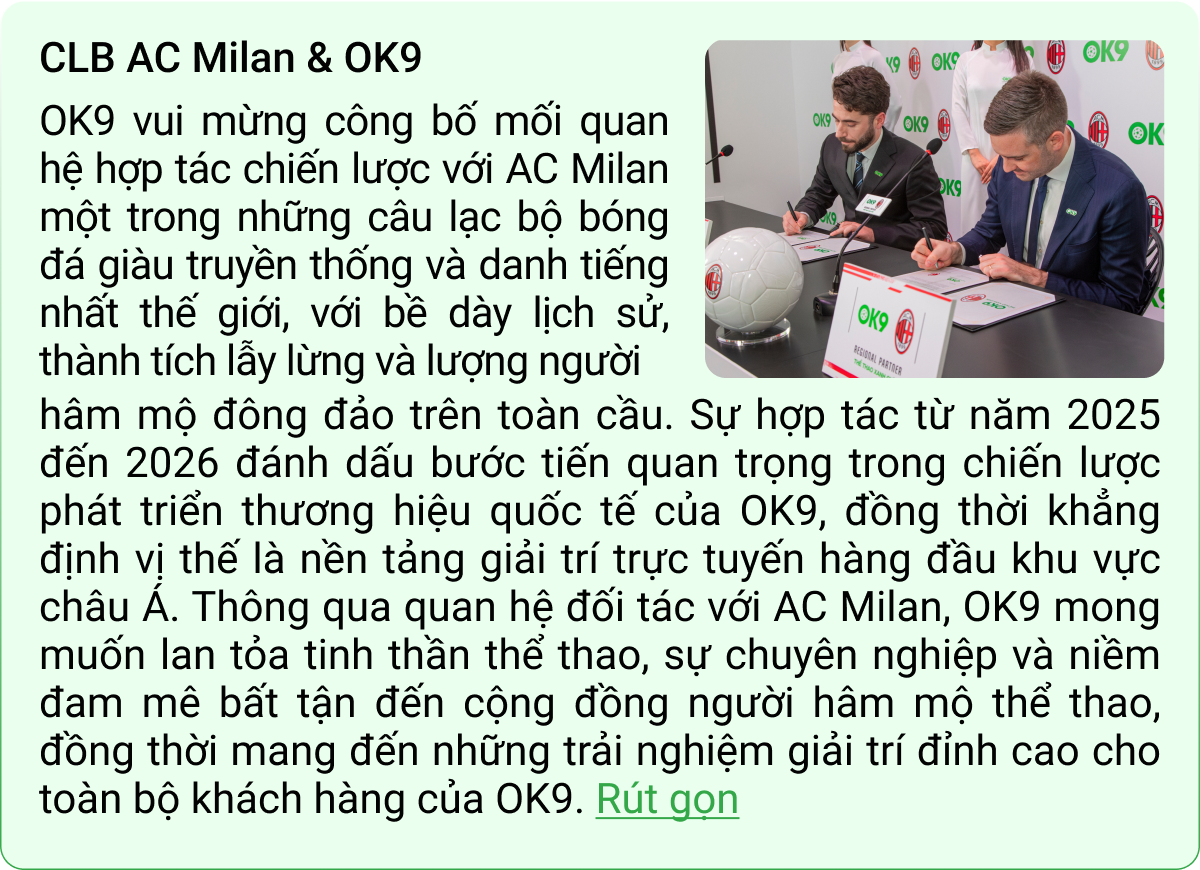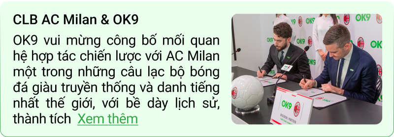 OK9 chính thức trở thành đối tác hợp tác với CLB AC Milan, là một trong những câu lạc bộ bóng đá giàu truyền thống và thành công nhất thế giới. Sự hợp tác giữa OK9 và CLB AC Milan là một bước tiến quan trọng giúp OK9 mở rộng tầm ảnh hưởng trong lĩnh vực thể thao, đồng thời OK9 và CLB AC Milan cam kết sẽ mang lại nhiều giá trị và nhiều trải nghiệm mới mẻ cho người hâm mộ bóng đá toàn cầu.